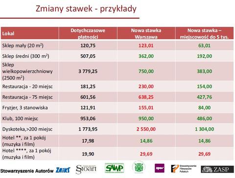 10 lipca 2013 r. Komisja Prawa Autorskiego zatwierdziła tabele wynagrodzeń za odtwarzanie filmów i muzyki ze wspólnego wniosku ośmiu organizacji zbiorowego zarządzania prawami autorskimi i pokrewnymi: SFP, ZAIKS, ZPAV, STOART, SAWP, ZASP, SAFT i STL. To dopiero początek drogi do wprowadzenia nowego systemu poboru opłat, który wejdzie w życie najwcześniej na początku przyszłego roku. W wyniku nowych regulacji opłaty mają być wnoszone do maksymalnie dwóch organizacji - jednej odpowiedzialnej za prawa autorskie oraz drugiej odpowiedzialnej za prawa pokrewne.
